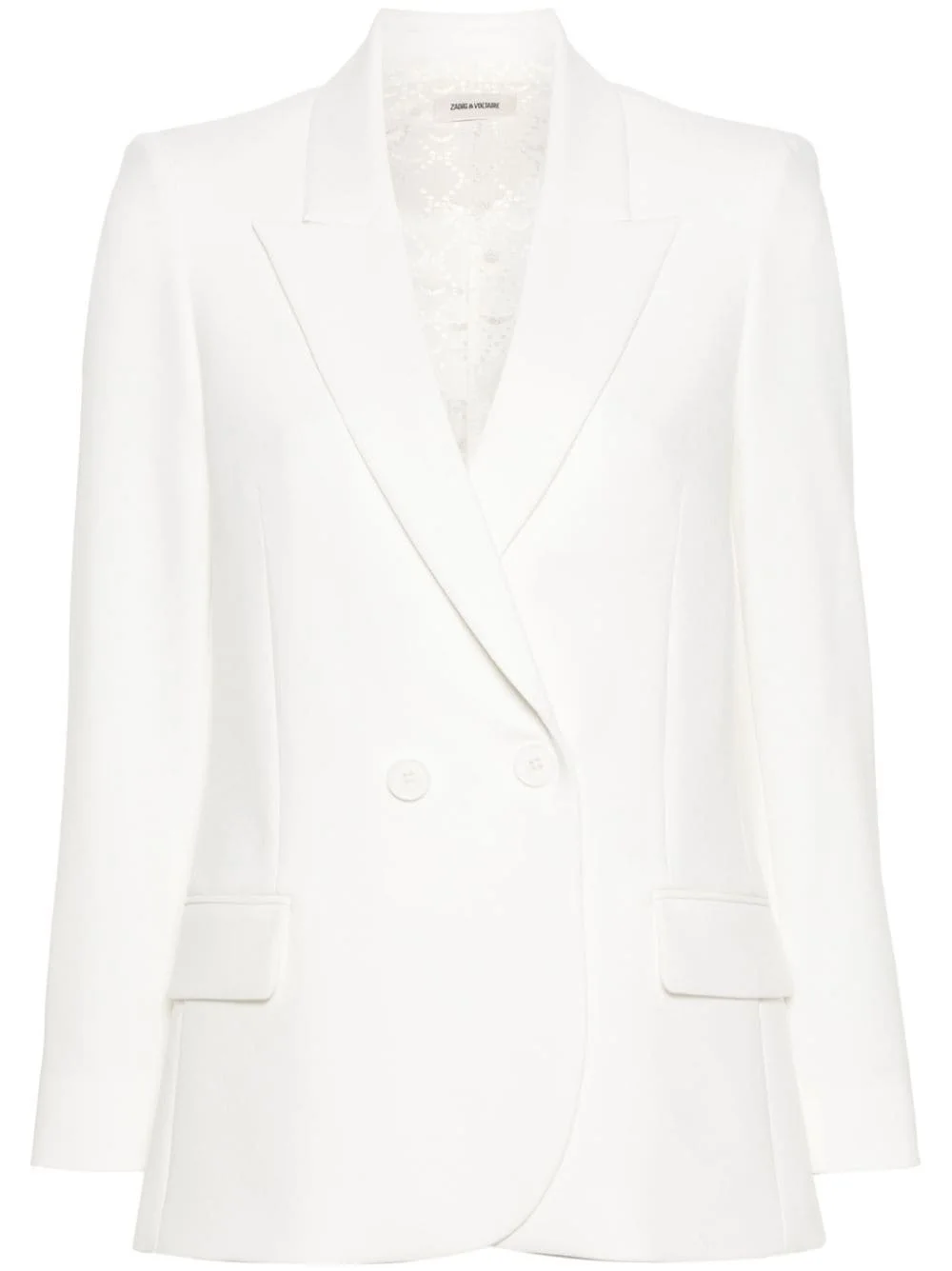 Visit crystal-embellished blazer From the front, Zadig&Voltaire’s white Visit blazer looks like a standard double-breasted style but it turns to reveal a crystal-embellished peace and love slogan arranged in the shape of the brand’s signature wings emblem. Highlights - White - Crepe texture - Peak lapels - Shoulder pads - Long sleeves - Split cuffs - Dart detailing - Two front flap pockets - Crystal embellishment - American rear vent - Logo-jacquard lining - Double-breasted button fastening Made in Italy Composition Lining: Viscose 100%, Acetate 65%, Polyester 35% Outer: Polyester 69%, Viscose 23%, Elastane 8% SIZE & FIT Model measurements Height 5 ft 9 in(1.76 m) Bust/Chest 31.88 in(81 cm) Hips 35.43 in(90 cm) Waist 24.8 in(63 cm) FittingInformation Designed for a slim fit that sits just away from the body offering a close yet comfortable fit The internal shoulder pads offer a structured shape Made from a midweight fabric This piece fits true to size – take your usual size Washing instructions Dry Clean Only
