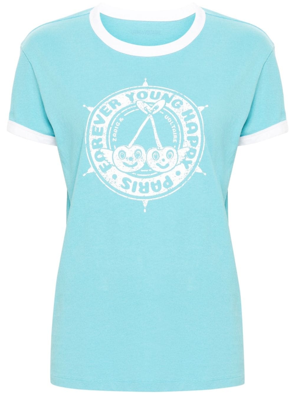Walk Insignia cotton T-shirt Highlights - Aqua blue - Cotton - Jersey texture - Contrasting borders - Crew neck - Short sleeves - Graphic print to the front - Short side slits - Straight hem Imported Composition Cotton 100% SIZE & FIT Model measurements Height 5 ft 9 in(1.76 m) Bust/Chest 31.1 in(79 cm) Hips 36.61 in(93 cm) Waist 24.8 in(63 cm) FittingInformation Designed for a relaxed fit, this piece allows for comfort and movement when worn Made from a midweight non-stretch fabric, this piece offers minimal elasticity when worn This piece fits true to size – take your usual size Washing instructions Machine Wash
