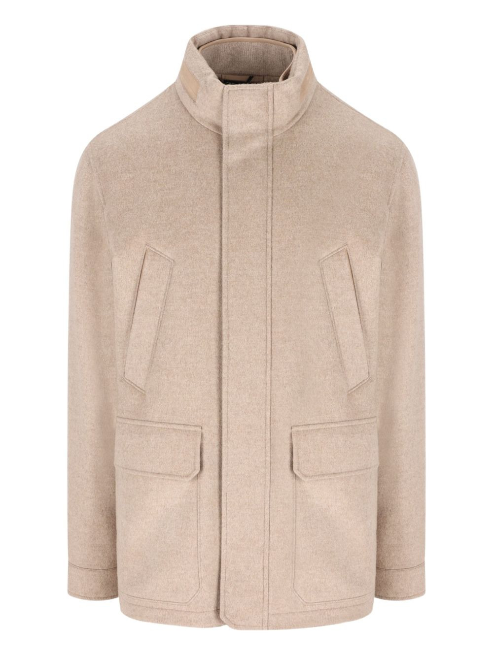 cashmere high-neck jacket Highlights - Beige - High neck - Calfskin details - Flap pockets - Welt pockets - Zip fastening Made in Italy Composition Outer: Cashmere 100%, Polyester 100% Lining: Wool 100%, Polyester 100% Washing instructions Read Manufacturer Guidelines