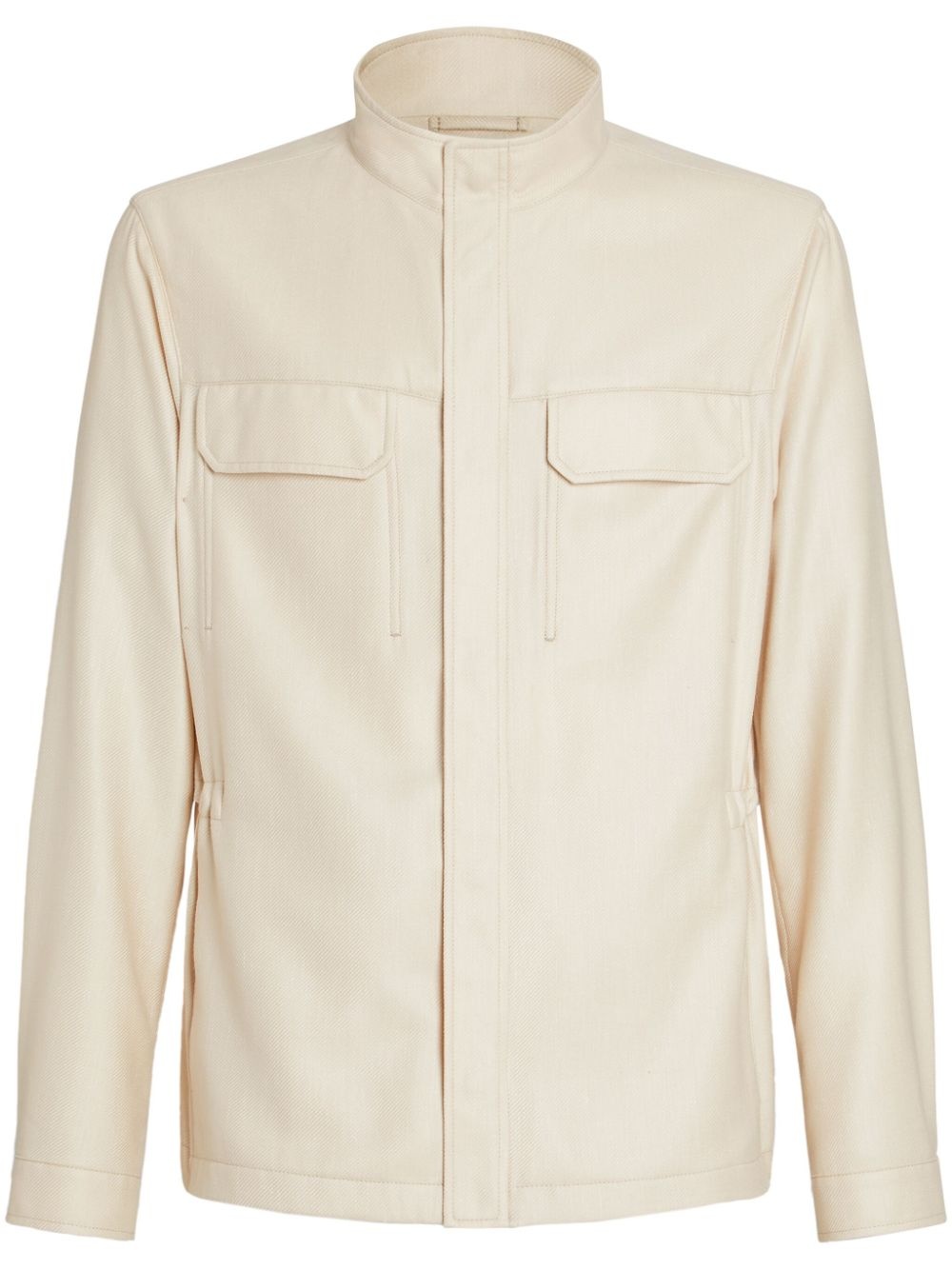 concealed-fastening jacket Highlights - Sand beige - Cashmere-silk blend - Concealed front fastening - High neck - Two front flap pockets - Long sleeves - Straight hem Imported Composition Cashmere 64%, Silk 23%, Linen/Flax 13%