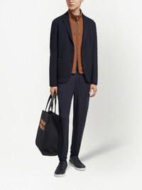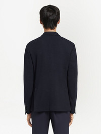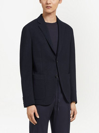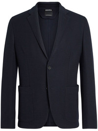 High Performance wool-cotton jacket Highlights - Navy blue - Wool-cotton blend - Tailored cut - Notched lapels - Two front patch pockets - Buttoned cuffs - Long sleeves - English rear vents Imported Composition Lining: Polyester 100% Outer: Wool 63%, Cotton 37%
