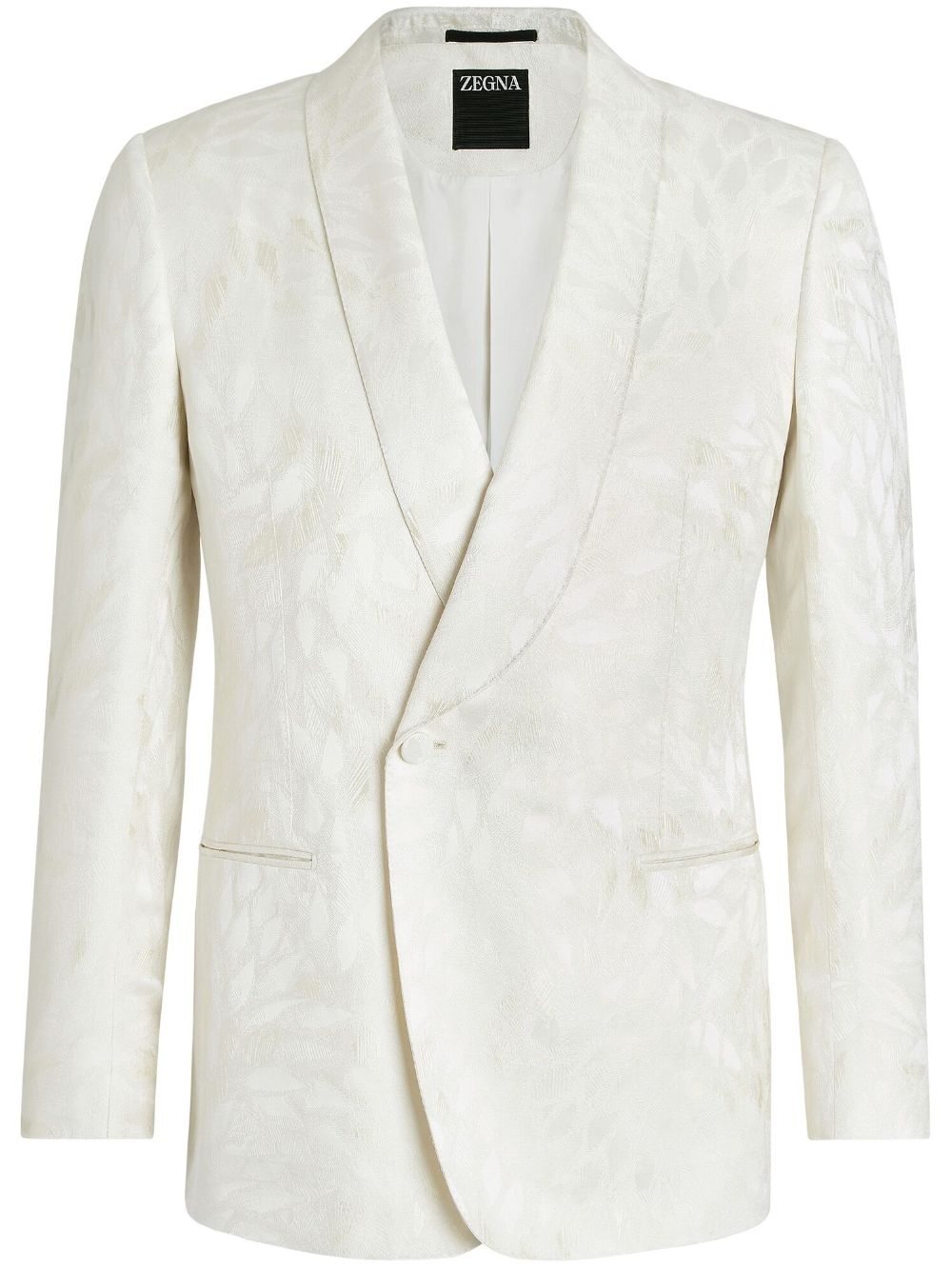 jacquard silk-wool evening jacket Showcasing Ermenegildo Zegna's elegant style, this blazer is elevated with a subtle jacquard pattern. Shawl lapels and an off-centre button fastening add to the refined look. Highlights - White - Mulberry silk-wool blend - Patterned jacquard - Shawl lapels - Off-centre front button fastening - Long sleeves - English rear vents - Two side welt pockets Made in Italy Composition Mulberry Silk 71%, Wool 29%