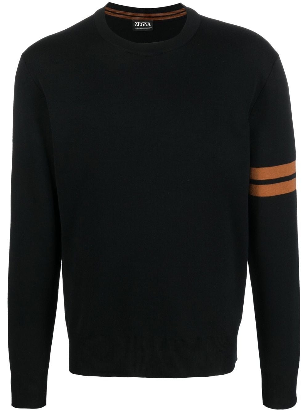 long-sleeve crew-neck jumper jet black wool fine knit ribbed detailing stripe detailing crew neck long sleeves straight hem Made in Italy Composition Wool 100% SIZE & FIT Model measurements Height 6 ft 1 in(1.85 m) Bust/Chest 37.79 in(96 cm) Hips 37.4 in(95 cm) Waist 30.7 in(78 cm) FittingInformation Designed to be unstructured, offering a loose fit throughout Made with a midweight knit, this piece offers some stretch This piece fits true to size – take your usual size Washing instructions Machine Wash