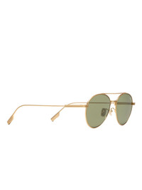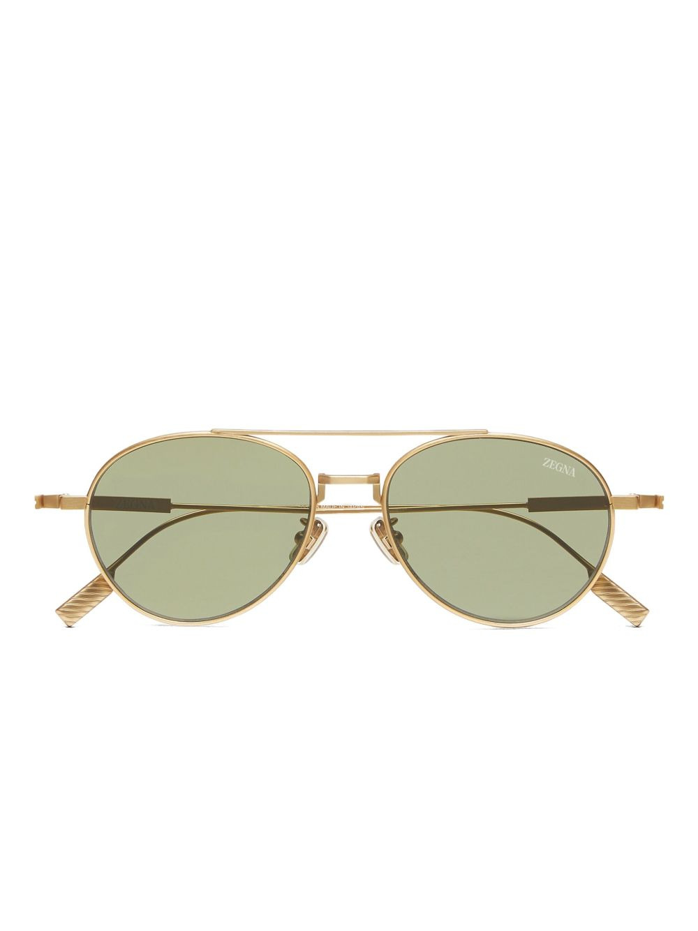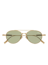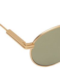 pilot-frame sunglasses Highlights - Gold - Pilot frame - Double bridge - Nose pads - Ribbed temple tip - These glasses come with a protective case. Imported Composition Titanium 100% SIZE & FIT Measurement Arm Length 6.1 in(15.5 cm) Bridge Width 0.66 in(1.7 cm) Lens Diameter 2.16 in(5.5 cm)