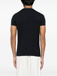 round-neck T-shirt Highlights - Navy blue - Short sleeves - Logo patch to the front Made in Italy Composition Modal 65%, Lyocell 25%, Elastane 10% SIZE & FIT Model measurements Height 6 ft 2 in(1.88 m) Bust/Chest 36.61 in(93 cm) Hips 36.61 in(93 cm) Waist 29.92 in(76 cm) FittingInformation Designed for a slim fit, offering a comfortable fit that sits just away from the body The narrow-cut sleeves offer a close fit at the arms Made from a midweight stretch fabric, this piece offers elasticity and flexibility when worn