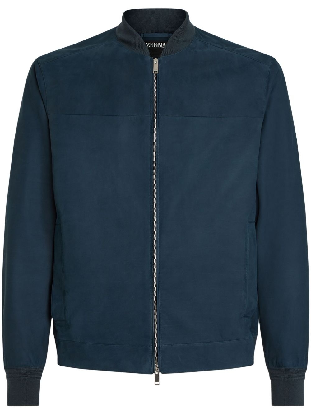 Secondskin bomber jacket Highlights - Teal blue - Front two-way zip fastening - Two side welt pockets - Ribbed band collar - Long sleeves Made in Italy Composition Outer: Calf Leather 100% SIZE & FIT FittingInformation Designed for a regular fit, allowing for a comfortably loose fit throughout the body Measurement LENGTH 25.98 in(66 cm)
