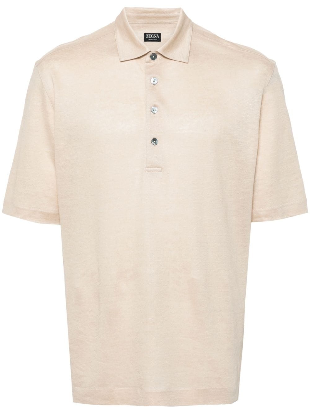short-sleeve linen polo shirt Highlights - Sand beige - Linen/flax - Polo collar - Short sleeves - Short side slits - Straight hem - Front button placket Made in Italy Composition Linen/Flax 100% SIZE & FIT Model measurements Height 6 ft 2 in(1.87 m) Bust/Chest 36.41 in(92.5 cm) Hips 35.43 in(90 cm) Waist 29.52 in(75 cm) FittingInformation Designed for a relaxed fit, this polo shirt offers comfort and movement Made from a midweight non-stretch fabric, this piece offers minimal elasticity when worn This piece fits true to size – take your usual size