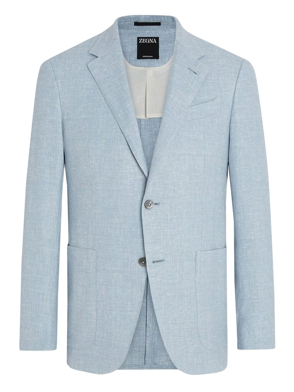 single-breasted blazer Highlights - Light blue - Front button fastening - Side patch pockets Imported Composition CALFSKIN 100%, Linen/Flax 46%, Wool 31%, Mulberry Silk 19%, Polyamide 3%, Elastane 1%