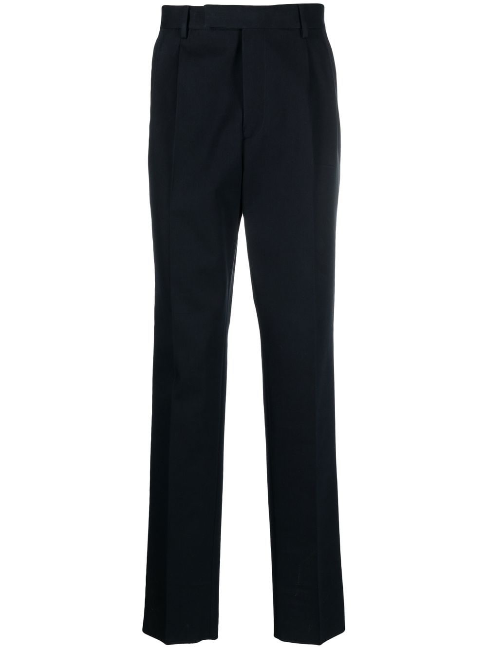 straight-leg tailored trousers midnight blue cotton-wool blend box-pleat design belt loops off-centre front fastening two side slash pockets two rear welt pockets straight hem Imported Composition Outer: Cotton 57%, Wool 43% Lining: Cotton 100% SIZE & FIT Model measurements Height 6 ft 2 in(1.89 m) Bust/Chest 37.4 in(95 cm) Hips 35.03 in(89 cm) Waist 27.95 in(71 cm) FittingInformation This piece fits true to size. We recommend you get your regular size Regular fit Made with a mid-weight non-stretch fabric Washing instructions Dry Clean Only