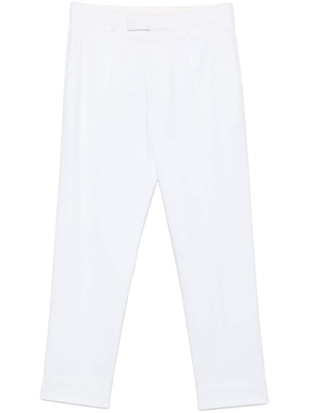 straight-leg trousers Highlights - White - Stretch-cotton - Twill weave - Straight leg - Concealed fly and button fastening - Belt loops - Two diagonal pockets to the sides - Two rear welt pockets - Pressed crease Imported Composition Outer: Cotton 98%, Elastane 2% Lining: Cotton 100% SIZE & FIT Model measurements Height 6 ft 2 in(1.87 m) Bust/Chest 37.79 in(96 cm) Hips 37.79 in(96 cm) Waist 30.31 in(77 cm) FittingInformation Designed for a straight-leg, allowing for an unrestricted and comfortable fit over the leg Made from a midweight stretch fabric, this piece offers elasticity and flexibility when worn