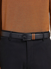 stripe-detail leather belt black/brown calf leather grained texture stripe detailing buckle fastening punched holes adjustable fit Made in Italy Composition CALFSKIN 100% SIZE & FIT Measurement WIDTH 1.25 in(3.2 cm)
