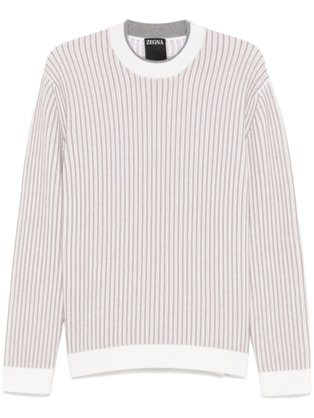 striped sweater Highlights - Light beige/white - Wool - Knitted construction - Vertical stripe pattern - Layered crew neck - Long sleeves - Jacquard logo motif to the back - Ribbed cuffs and hem Made In Italy Composition Wool 100% SIZE & FIT Model measurements Height 6 ft 2 in(1.87 m) Bust/Chest 36.22 in(92 cm) Hips 35.43 in(90 cm) Waist 29.13 in(74 cm) FittingInformation Designed for a regular fit, offering a comfortable loose fit throughout the body Made with a midweight knit, this piece offers some stretch