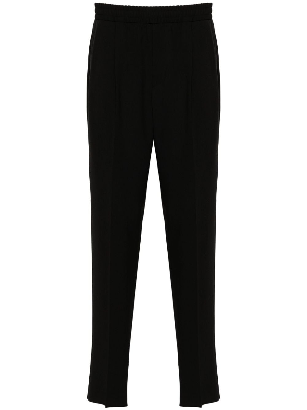 tapered trousers Highlights - Black - Interlock twill weave - Mid-rise - Elasticated waistband with internal drawstring - Pressed crease - Two side welt pockets - Two rear welt pockets - Tapered leg Imported Composition Outer: Polyester 53%, Wool 43%, Elastane 4% Lining: Cotton 100% SIZE & FIT Model measurements Height 6 ft 1 in(1.86 m) Bust/Chest 36.61 in(93 cm) Hips 37 in(94 cm) Waist 28.74 in(73 cm) FittingInformation Designed for a relaxed tapered leg, allowing a comfortable loose fit above the knee with a closer fit towards the calves The elasticated waist allows for a comfortable fit Made from a midweight stretch fabric, this piece offers elasticity and flexibility when worn