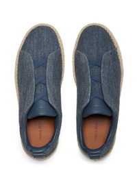 Triple Stitch slip-on espadrilles Highlights - Navy blue - Elasticated panelling - Slip-on style - Round toe - Branded leather insole - Braided raffia sole Made in Italy Composition Outer: Linen/Flax 44%, Viscose 30%, Calf Leather 20%, Cotton 6% Sole: Rubber 100% Lining: Calf Leather 100% SIZE & FIT Measurement HEEL 1.18 in(3 cm) Sole height 1.18 in(3 cm)