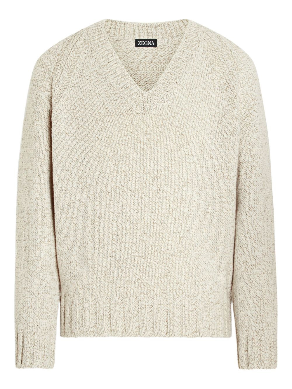 LIGHT TAUPE AND WHITE MÉLANGE CASHMERE AND WOOL V-NECK