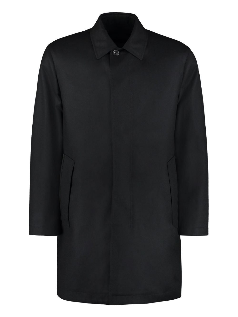 wool coat Highlights - Black - Concealed front button fastening - Two side welt pockets - Long sleeves - Straight hem Made in Italy Composition Lining: Polyester 100% Outer: Wool 100%, Calf Leather 100% Washing instructions Dry Clean Only