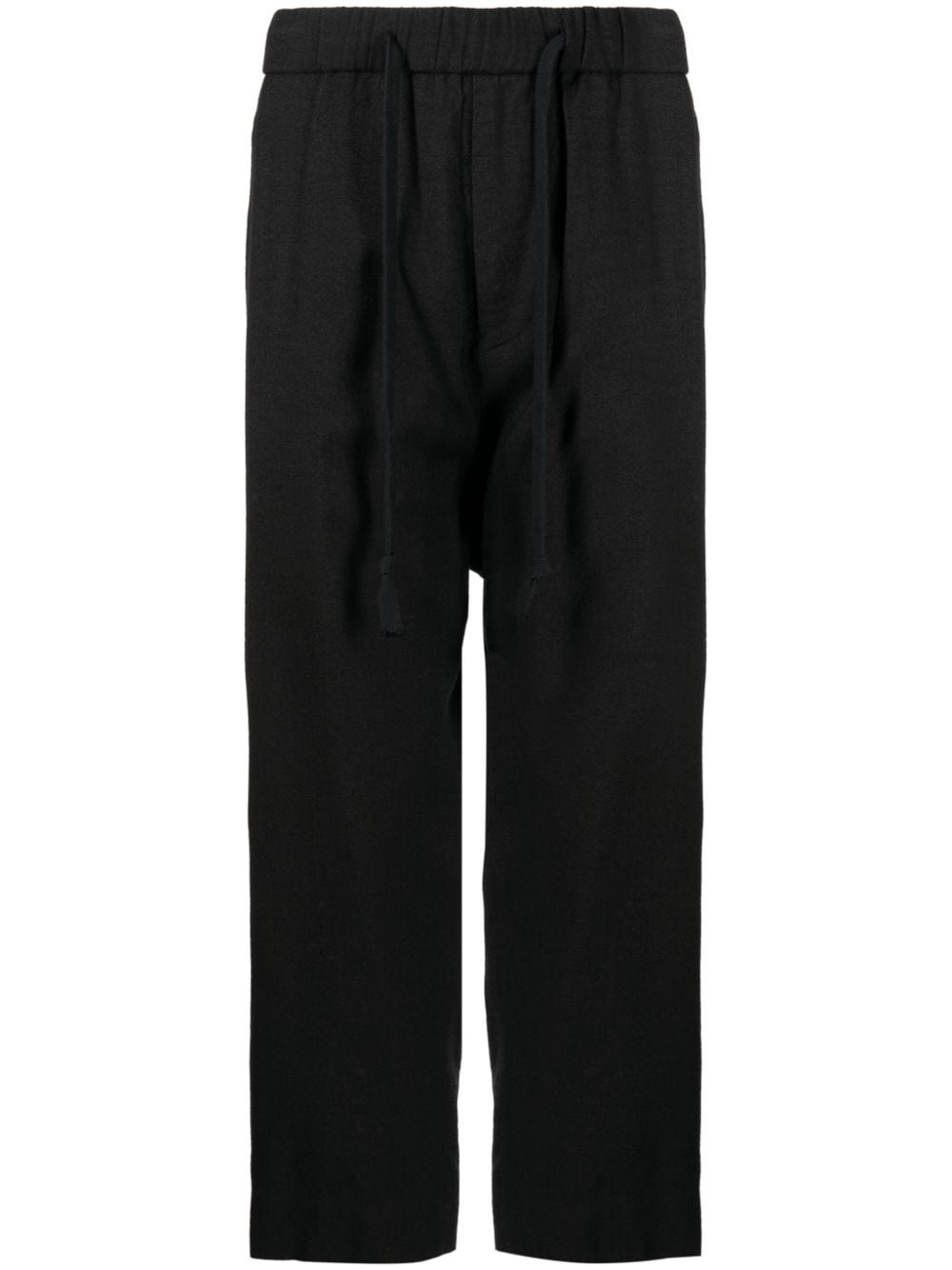 drop-crotch drawstring cropped trousers Highlights - Black - Wool-silk blend - Ruched detailing - Drop crotch - Elasticated drawstring waistband - Two side inset pockets - Two rear button-fastening jetted pockets - Cropped Imported Composition Wool 83%, Silk 17% SIZE & FIT Model measurements Height 6 ft 2 in(1.87 m) Bust/Chest 31.49 in(80 cm) Hips 37.79 in(96 cm) Waist 27.95 in(71 cm) FittingInformation Designed for a tapered leg, offering a loose unrestricted fit over the leg with a closer fit towards the ankle The elasticated waist allows for a comfortable fit Made from a midweight non-stretch fabric This piece fits true to size – take your usual size Washing instructions Dry Clean Only