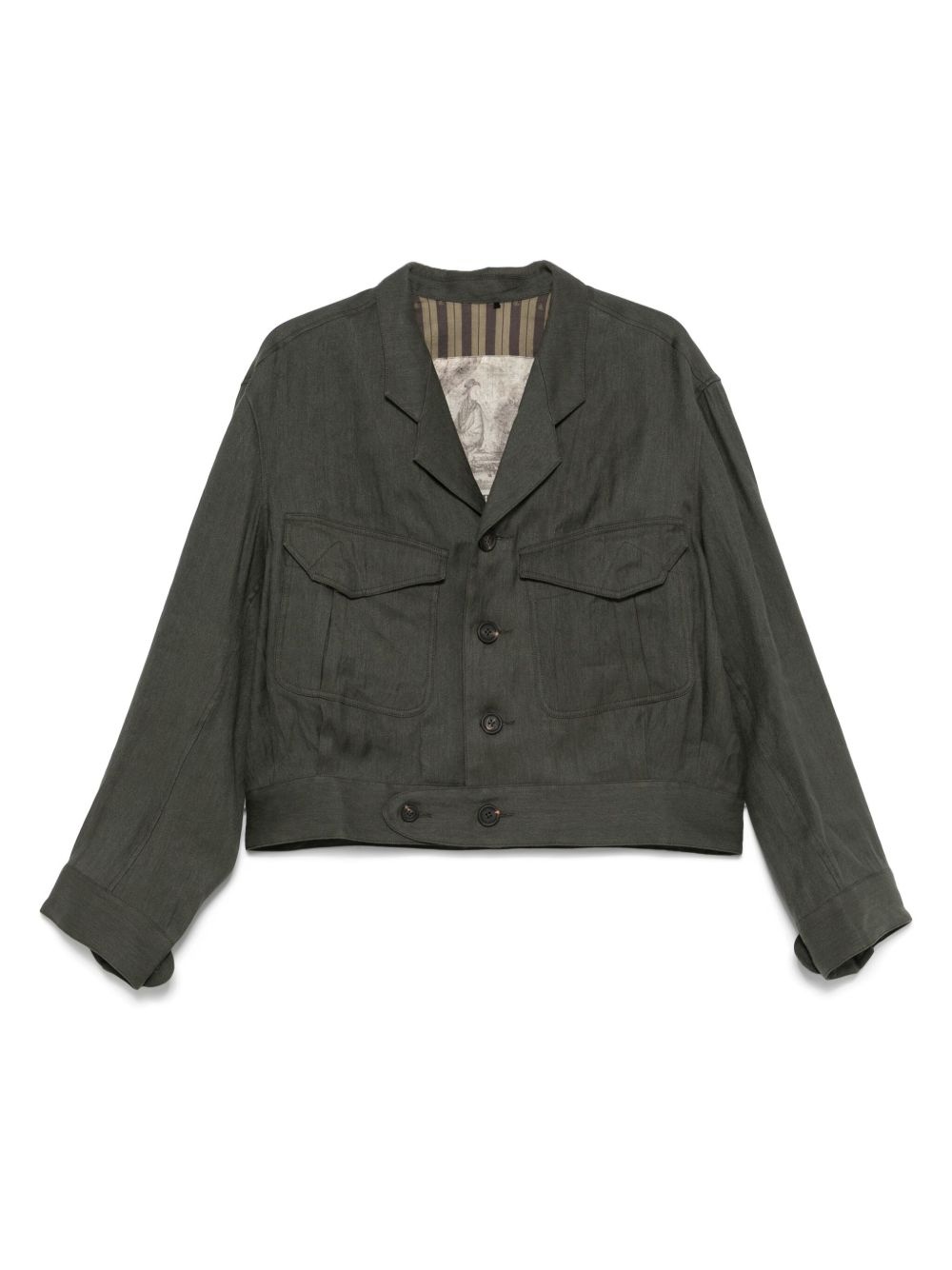 notch-lapel jacket Highlights - Dark green - Front button fastening - Buttoned cuffs - Two front flap pockets - Pleat detailing Imported Composition Cotton 100%, Acetate 75%, Viscose 25% SIZE & FIT Model measurements Height 6 ft 2 in(1.87 m) Bust/Chest 36.22 in(92 cm) Hips 37 in(94 cm) Waist 27.95 in(71 cm) FittingInformation Designed for a boxy fit, intended for a loose fit throughout Cropped in length Made from a midweight non-stretch fabric