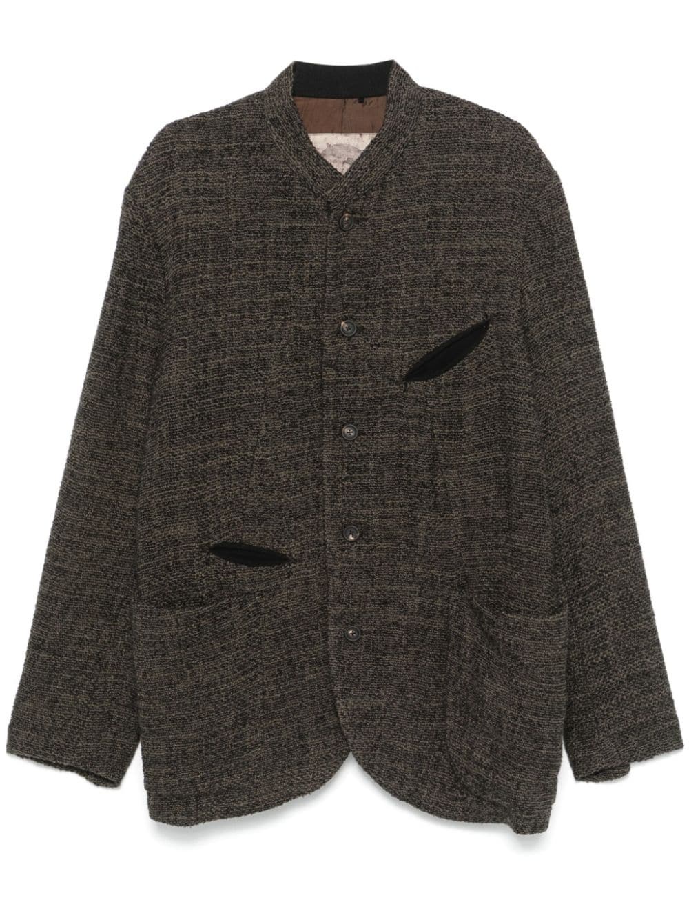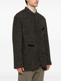 single-breasted jacket Highlights - Black - Virgin wool blend - Textured finish - Melange effect - Front button fastening - Stand-up collar - Long sleeves - Buttoned cuffs - Chest welt pocket - Two front patch pockets - Central rear vent - Full lining - Internal pocket - Straight hem Imported Composition Outer: Virgin Wool 78%, Cashmere 50%, Linen/Flax 50%, Polyacrylonitrile 22% Lining: Cotton 100%, Cupro 100% SIZE & FIT Model measurements Height 6 ft 2 in(1.87 m) Bust/Chest 37.79 in(96 cm) Hips 37.79 in(96 cm) Waist 30.31 in(77 cm) FittingInformation Designed to be unstructured, offering a loose fit throughout The vented hem offers movement at the rear Made from a midweight non-stretch fabric