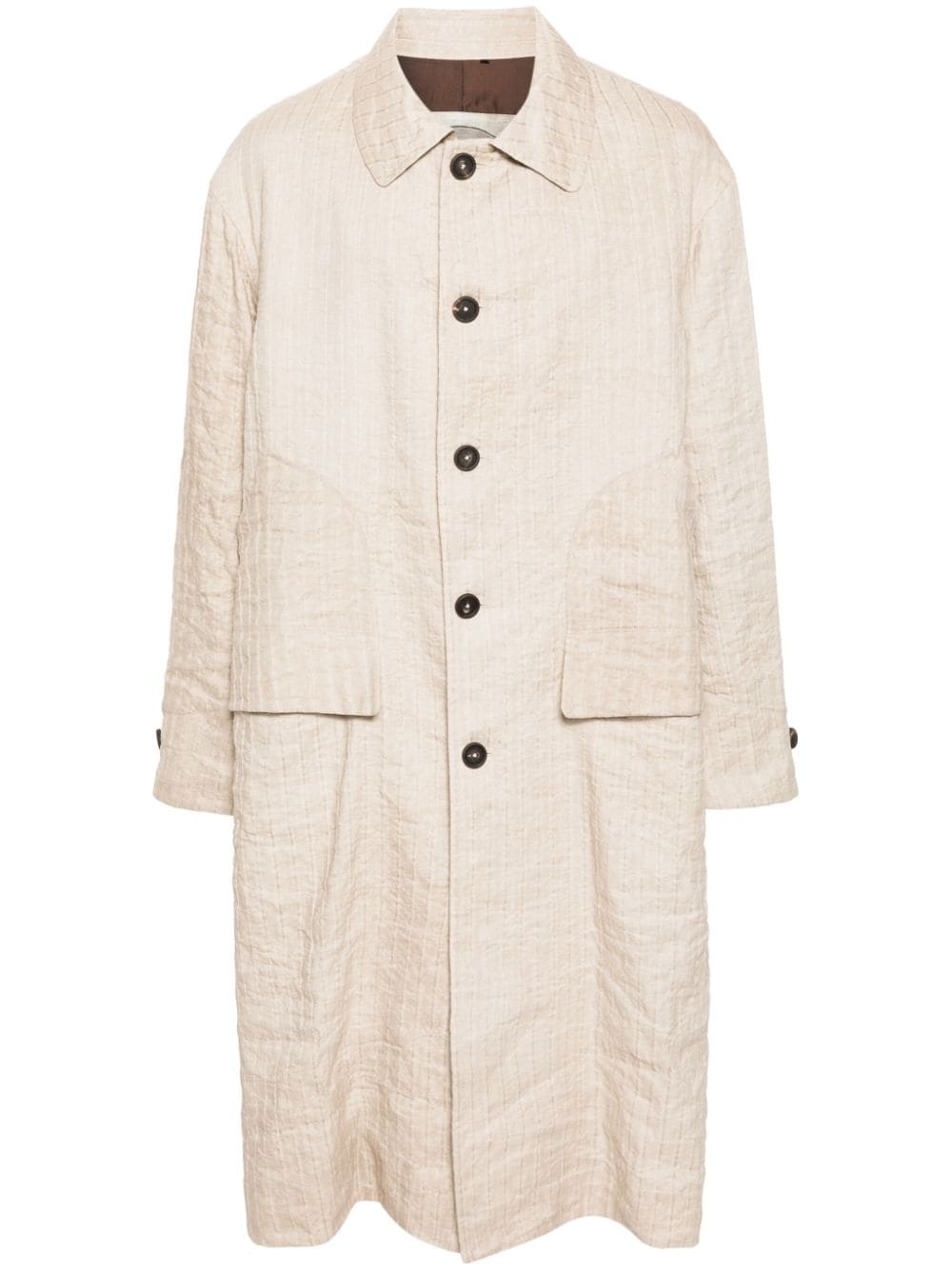 single-breasted long coat Highlights - Sand beige - Cotton blend - Twill weave - Tonal vertical stripe pattern - Spread collar - Long sleeves with button-fastening straps - Two side patch pockets - Two front flap pockets - Calf-length - Straight hem - Central rear vent - Internal slip pocket - Full lining - Front button fastening Imported Composition Lining: Cupro 50%, Cotton 50% Outer: Ramie 39%, Cotton 14%, Metal 7% SIZE & FIT Model measurements Height 6 ft 2 in(1.88 m) Bust/Chest 36.61 in(93 cm) Hips 35.82 in(91 cm) Waist 27.95 in(71 cm) FittingInformation Designed for an oversized fit, offering additional room throughout The vented hem offers movement at the rear Made from a midweight non-stretch fabric This piece fits true to size – take your usual size