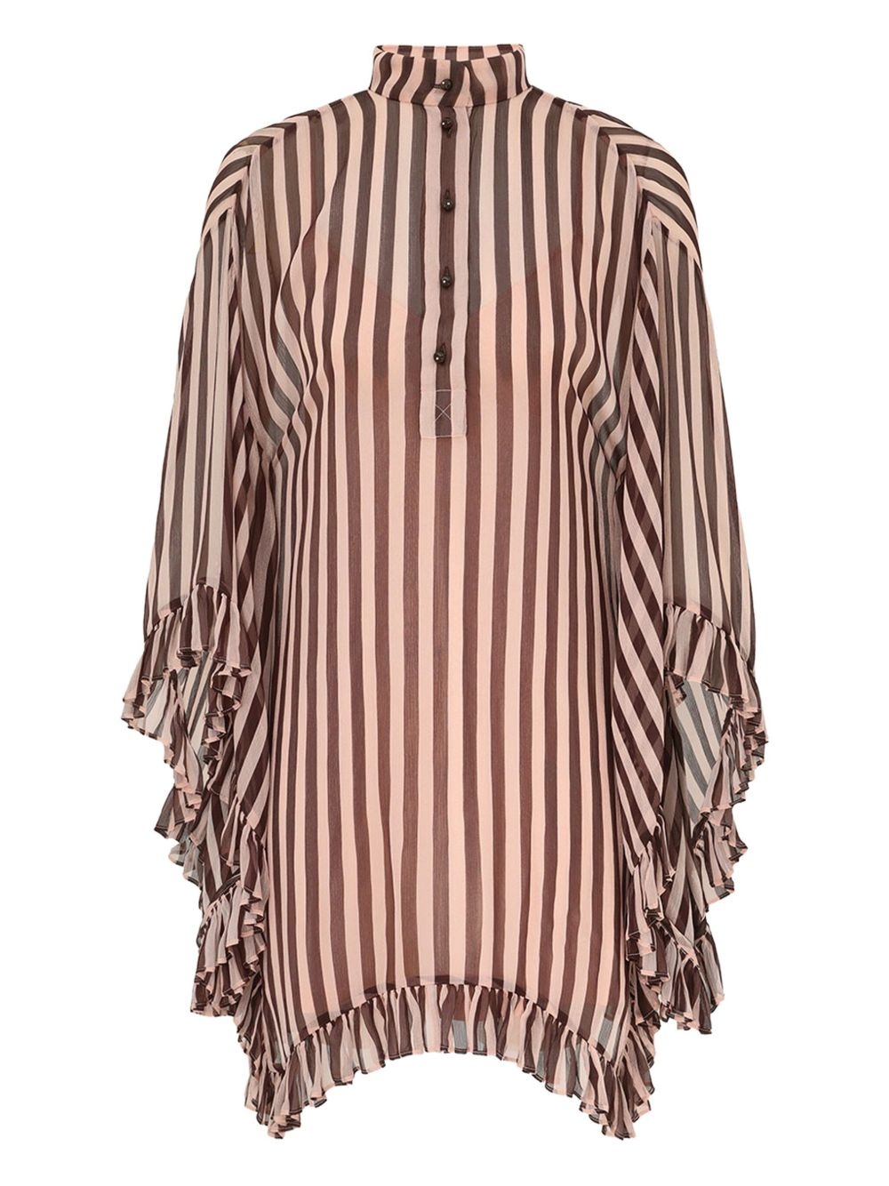 Balance tunic top Highlights - Chocolate brown - Front button placket - Multi-way stripe pattern - Ruffled trim - Long draped sleeves Imported Composition Viscose 100%, Recycled Polyester 86%, Spandex/Elastane 14% Washing instructions Dry Clean Only