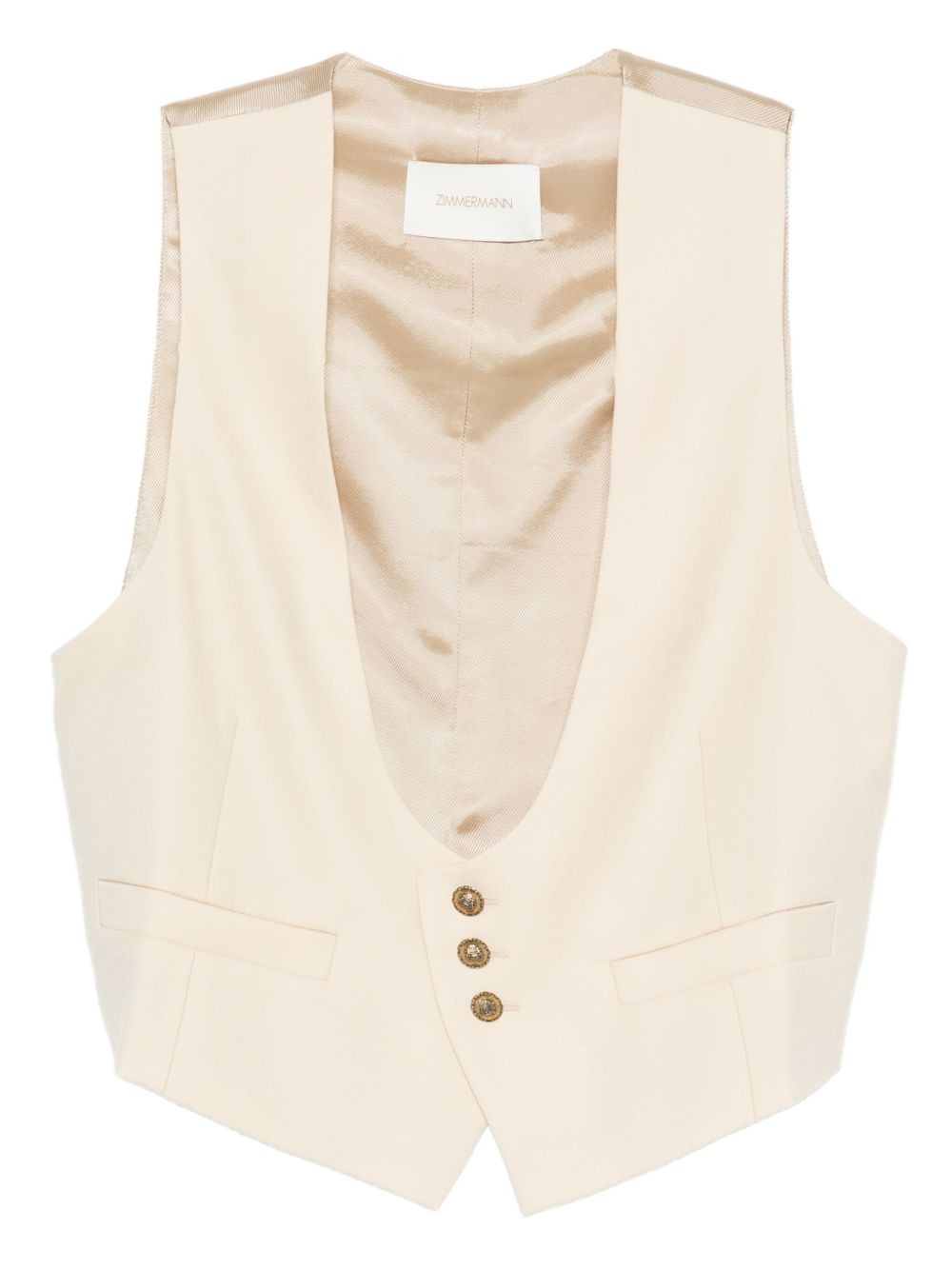 buttoned gilet Highlights - Ecru - Front button fastening - Front welt pockets - V-neck - Sleeveless Imported Composition Outer: Wool 98%, Elastane 2% Lining: Viscose 100% SIZE & FIT Model measurements Height 5 ft 10 in(1.77 m) Bust/Chest 32.28 in(82 cm) Hips 35.03 in(89 cm) Waist 25.19 in(64 cm) Washing instructions Read Manufacturer Guidelines
