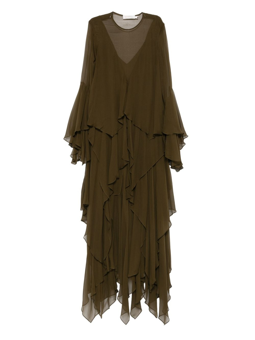 cascading-ruffle maxi dress Highlights - Moss green - Tiered ruffles - Long sleeves - Bell sleeves - Sheer yoke - Asymmetrical hem Imported Composition Silk 100% SIZE & FIT Model measurements Height 5 ft 9 in(1.75 m) Bust/Chest 34.64 in(88 cm) Hips 36.61 in(93 cm) Waist 26.37 in(67 cm) Washing instructions Read Manufacturer Guidelines