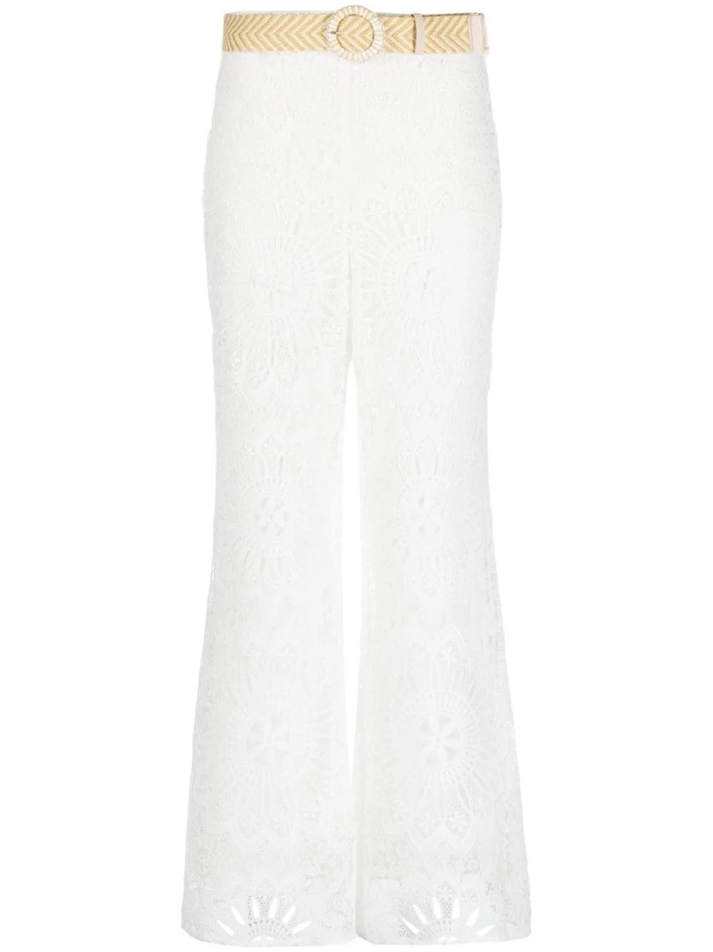 Chintz Dolly lace trousers ZIMMERMANN draws inspiration from the '70s in the billowy, wide-leg silhouette of these white trousers. They're crafted with an intricate floral lace overlay and finished with a sunshine-hued raffia belt, nodding to the brand's vibrant aesthetic. Highlights - Ivory white - Cotton - Floral-lace detailing - Belted waist - High waist - Wide leg Imported Composition Outer: Polyester 100% Lining: Cotton 100% SIZE & FIT Measurement FRONT RISE 12.59 in(32 cm) HIPS 34.64 in(88 cm) WAIST 25.98 in(66 cm) Washing instructions Dry Clean Only
