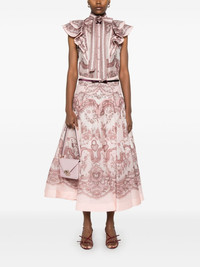 Crush flared midi skirt Highlights - Rose pink - Concealed rear hook and zip fastening - Two side slit pockets - Detachable and adjustable waist belt - A-line Imported Composition Outer: Polyester 100%, Linen/Flax 55%, Silk 45% Lining: Cotton 100% SIZE & FIT Model measurements Height 5 ft 11 in(1.8 m) Bust/Chest 31.49 in(80 cm) Hips 36.61 in(93 cm) Waist 24.4 in(62 cm) Measurement HIPS 40.15 in(102 cm) LENGTH 34.64 in(88 cm) WAIST 27.55 in(70 cm) FittingInformation This midi-length skirt is intended to be worn high on the waist Made from a midweight non-stretch fabric