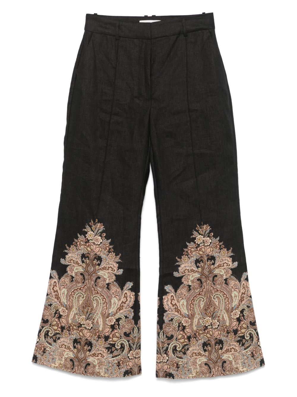 Dawning trousers Highlights - Black - Concealed front button, hook and zip fastening - Belt loops - Two diagonal pockets to the sides - Two rear welt pockets Imported Composition Linen/Flax 100% SIZE & FIT Model measurements Height 5 ft 9 in(1.75 m) Bust/Chest 34.64 in(88 cm) Hips 36.61 in(93 cm) Waist 26.37 in(67 cm) FittingInformation Designed with a flared hem, these trousers allow for a close fit at the waist with a slim fit over the leg and widening towards the hem Made from a midweight non-stretch fabric Washing instructions Dry Clean Only