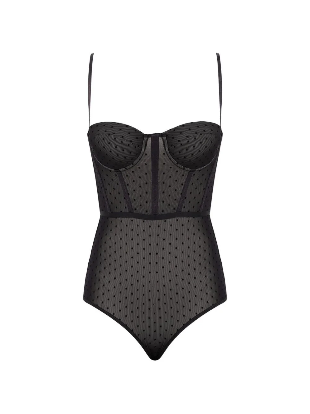 dotted bodysuit Highlights - Black - Polka dot pattern - Bustier-style top - Rear zip fastening - Underwire bust - Just a reminder that this piece must be tried on over your own garments. Imported Composition Nylon 85%, Spandex/Elastane 15% Washing instructions Read Manufacturer Guidelines