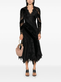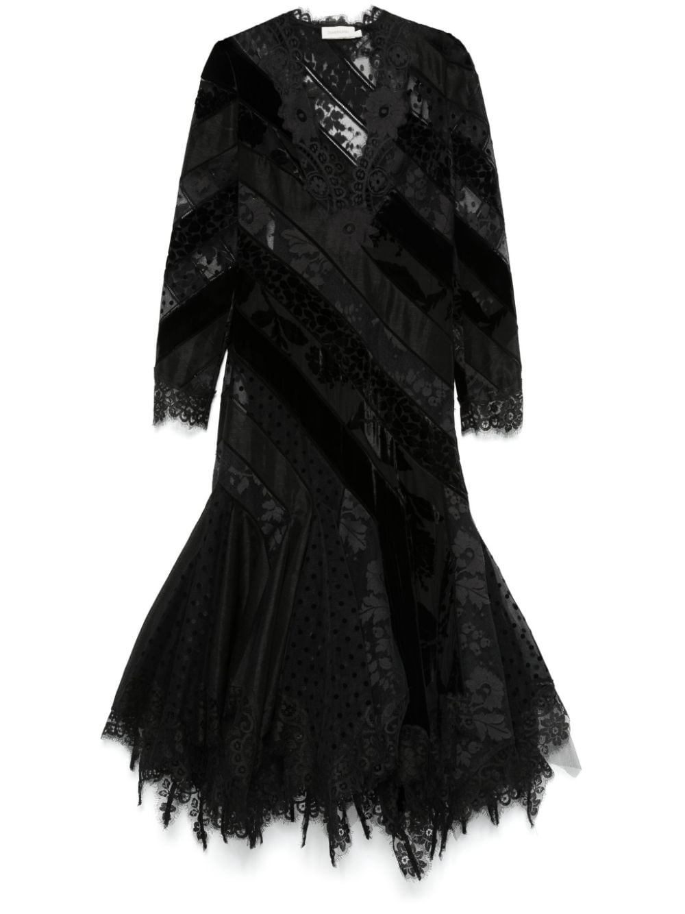 Eden gown Highlights - Black - Cotton blend - All-over floral lace detailing - Diagonal stripe pattern - Concealed side zip fastening - Velvet trim - Polka dot detailing - V-neck - Long sleeves - Internal slip dress - Tulle lining - Flared hem - Mid-length Made in Italy Composition Viscose 100%, Cotton 65%, Polyamide 35% SIZE & FIT Model measurements Height 5 ft 11 in(1.8 m) Bust/Chest 33.07 in(84 cm) Hips 37.4 in(95 cm) Waist 25.19 in(64 cm) Measurement SLEEVE LENGTH 24.01 in(61 cm) HIPS 40.15 in(102 cm) LENGTH 51.57 in(131 cm) WAIST 33.85 in(86 cm) FittingInformation Designed for a slim fit that sits just away from the body offering a close yet comfortable fit The detachable slip sits just away from the body, offering a close yet comfortable fit Made from a midweight non-stretch fabric