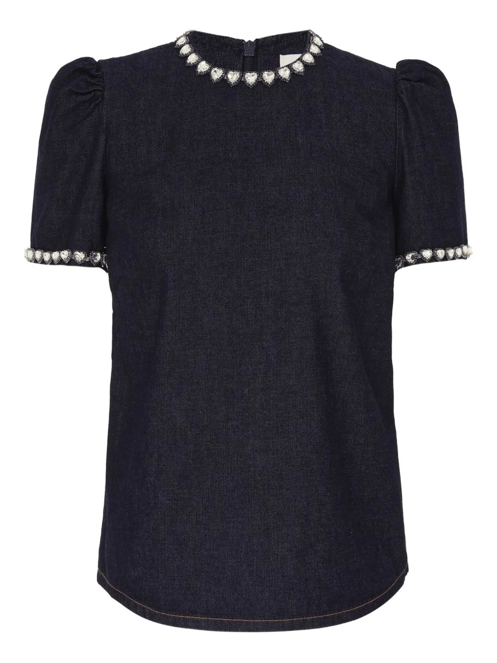 embellished denim top Highlights - Dark blue - Embellished neckline - Short puff sleeves - Zip fastening at the back Imported Composition Cotton 100% Washing instructions Dry Clean Only