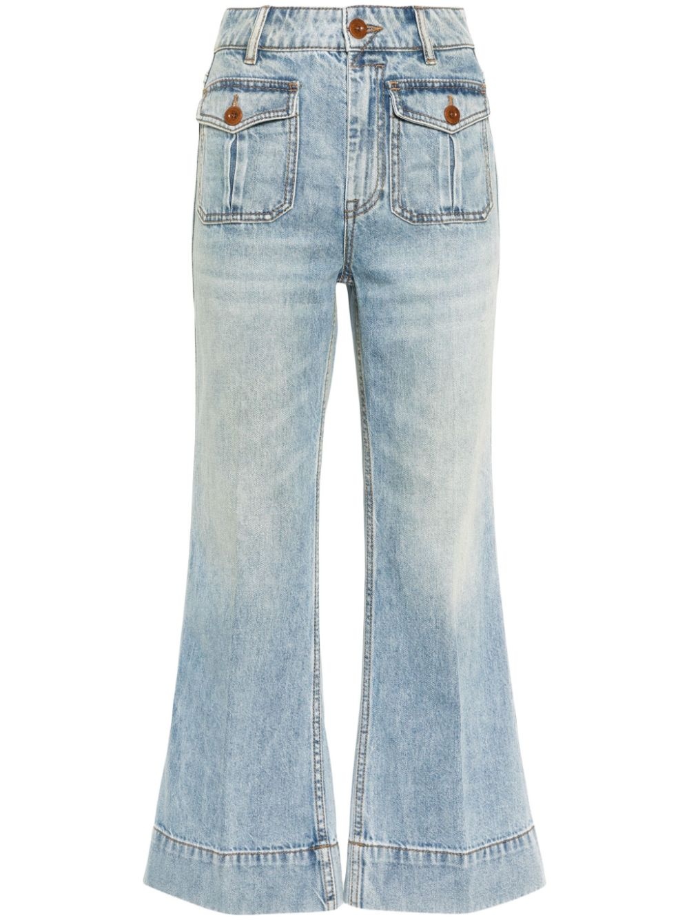 flared cropped jeans Highlights - Light blue - Cotton - Denim - Belt loops - Two front button-fastening jetted pockets - Mini logo tag - Logo patch to the rear - Flared hem - Cropped leg - Concealed fly and button fastening Imported Composition Cotton 100% Washing instructions Machine Wash
