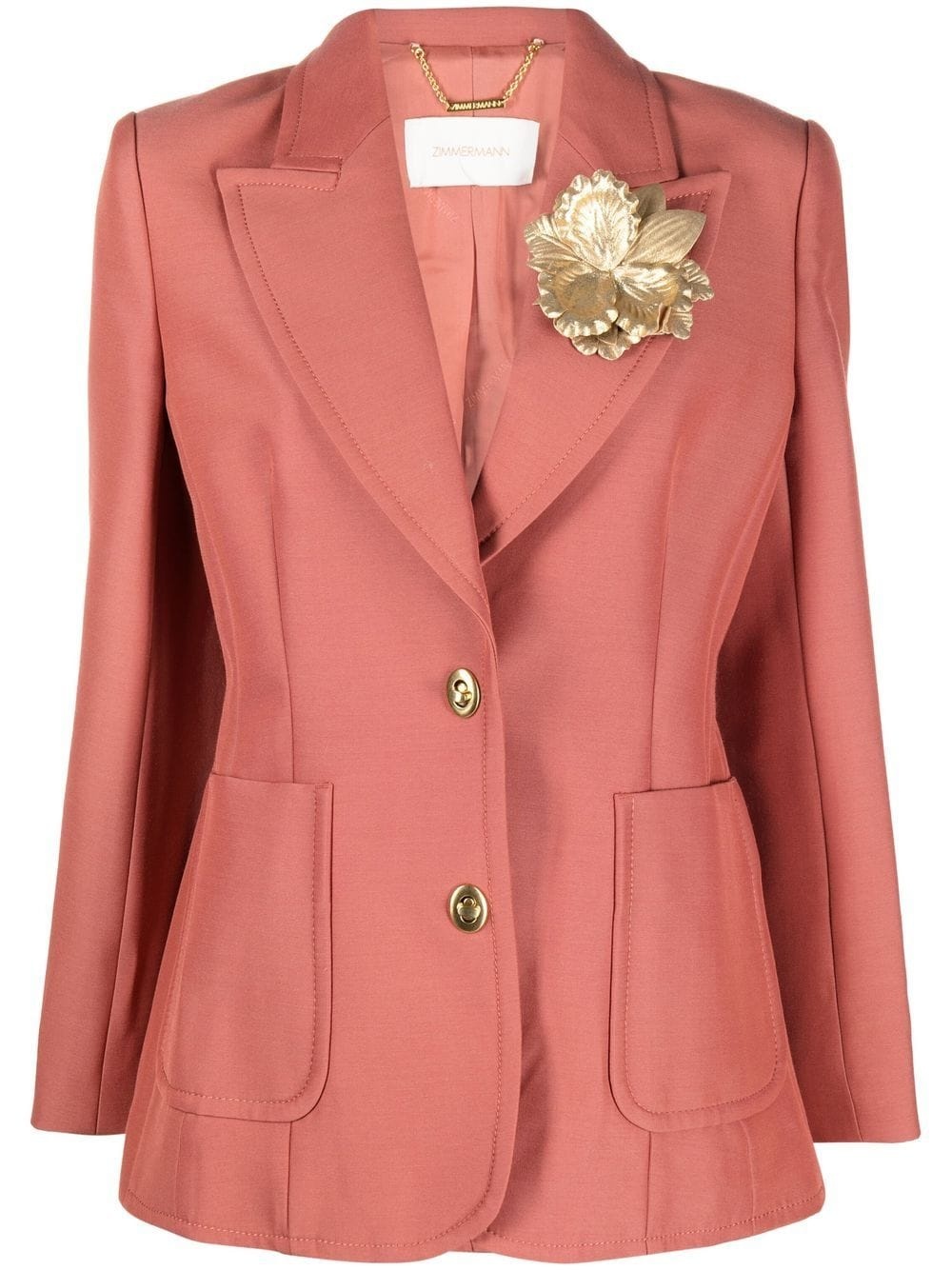 floral-applique single-breasted blazer Presented in a pink hue, this blazer speaks to Zimmerman's fondness for delicate details. This classic single-breasted piece is elevated by a floral applique on the chest. Imported Composition Lining: Viscose 73%, Silk 27% Outer: Wool 65%, Viscose 35% SIZE & FIT Model measurements Height 5 ft 9 in(1.75 m) Bust/Chest 32.67 in(83 cm) Hips 36.22 in(92 cm) Waist 24.8 in(63 cm) FittingInformation This piece fits true to size. We recommend you get your regular size Cut for a slim fit Made with a mid-weight non-stretch fabric Washing instructions Dry Clean Only