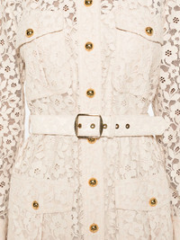floral-lace belted mini dress Highlights - Cream - Floral lace - Belted waist - Button front - Long sleeves - Patch pockets Imported Composition Lining: Silk 100% Outer: Polyester 100% SIZE & FIT Model measurements Height 5 ft 11 in(1.8 m) Bust/Chest 31.49 in(80 cm) Hips 36.61 in(93 cm) Waist 24.4 in(62 cm) Washing instructions Dry Clean Only