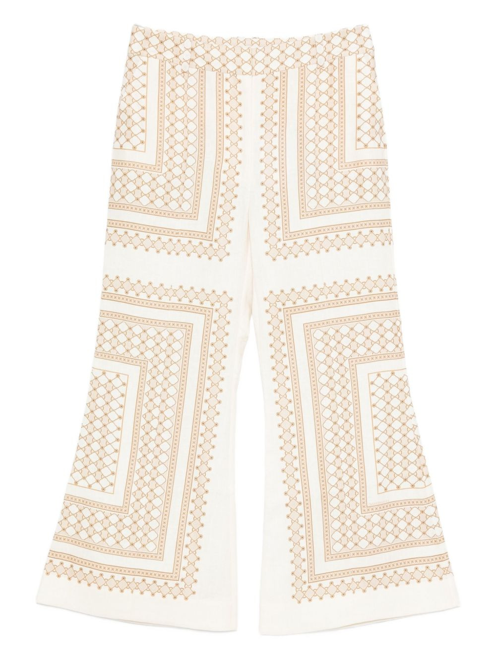 geometric-print flared trousers Highlights - Cream - Geometric print - Flared leg - High waist Imported Composition Lining: Cotton 100% Outer: Linen/Flax 100% Washing instructions Read Manufacturer Guidelines