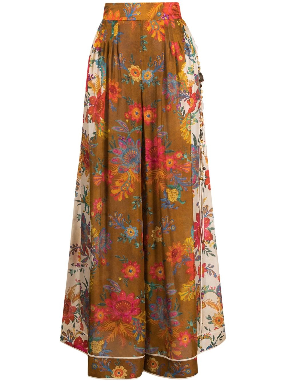 Ginger Relaxed silk trousers Part of ZIMMERMANN's Summer Swim 2023 Collection, these Ginger Relaxed trousers are saturated in multicolour blooms. Spun from silk, they feature a removable beaded tie belt. Highlights - Brown/multicolour - Silk - All-over floral print - Elasticated waistband - Detachable belt - Wide leg Imported Composition Silk 100% SIZE & FIT Model measurements Height 5 ft 10 in(1.78 m) Bust/Chest 31.49 in(80 cm) Hips 35.03 in(89 cm) Waist 23.62 in(60 cm) FittingInformation Designed with a wide-leg cut, these trousers allow for a close fit at the waist and offer a loose and roomy fit over the leg The partially elasticated waistband offers increased movement and comfort at the waist Made from a lightweight non-stretch fabric This piece fits true to size – take your usual size Washing instructions Dry Clean Only