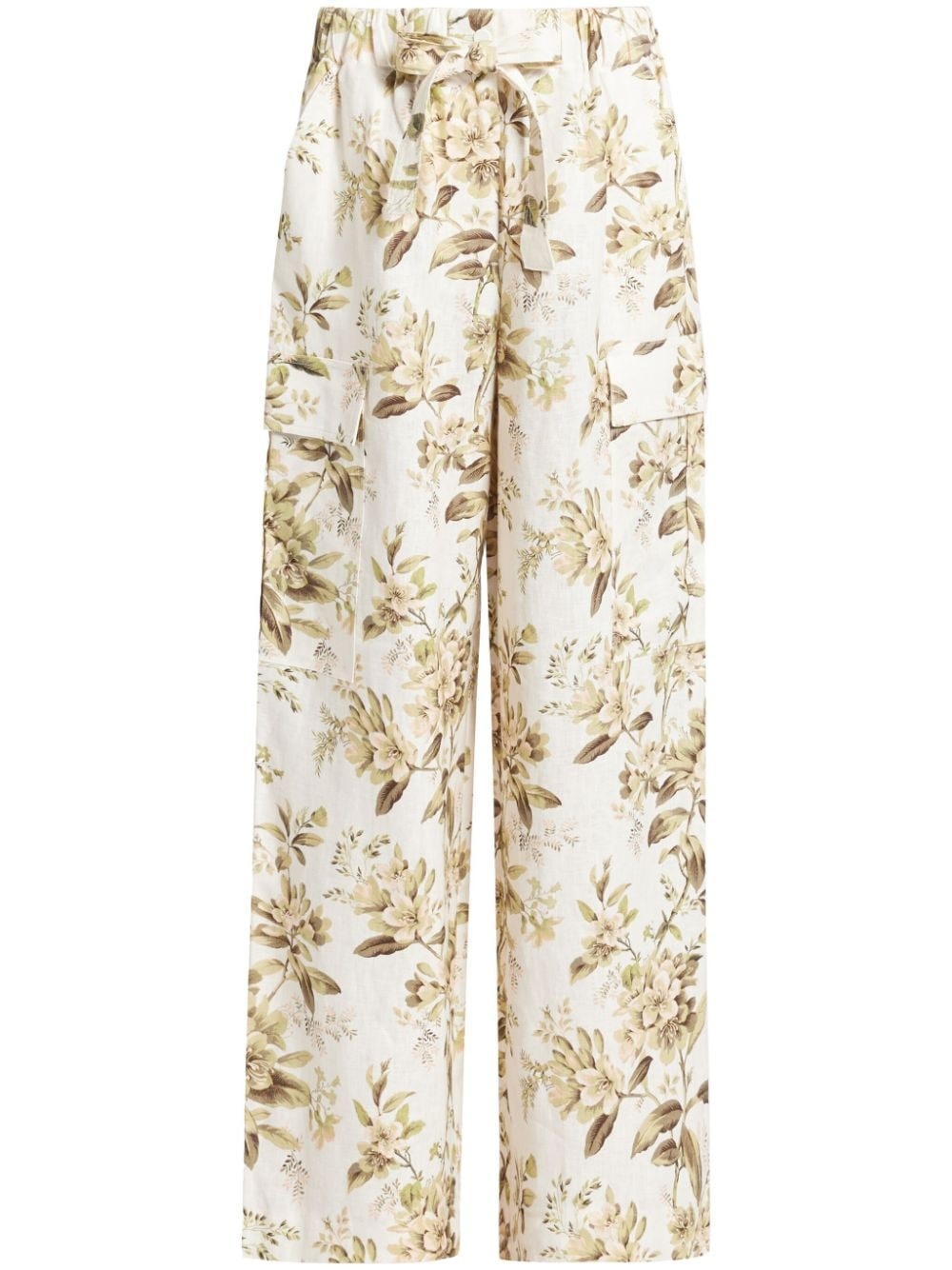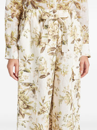 Golden trousers Highlights - Ecru/multicolour - Linen/flax - All-over floral print - High-waisted - Elasticated drawstring waistband - Two side slash pockets - Two side cargo pockets - Wide leg Imported Composition Linen/Flax 100% SIZE & FIT Measurement FRONT RISE 13.77 in(35 cm) HIPS 44.09 in(112 cm) WAIST 29.13 in(74 cm) Washing instructions Read Manufacturer Guidelines