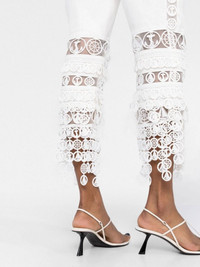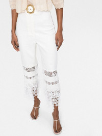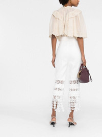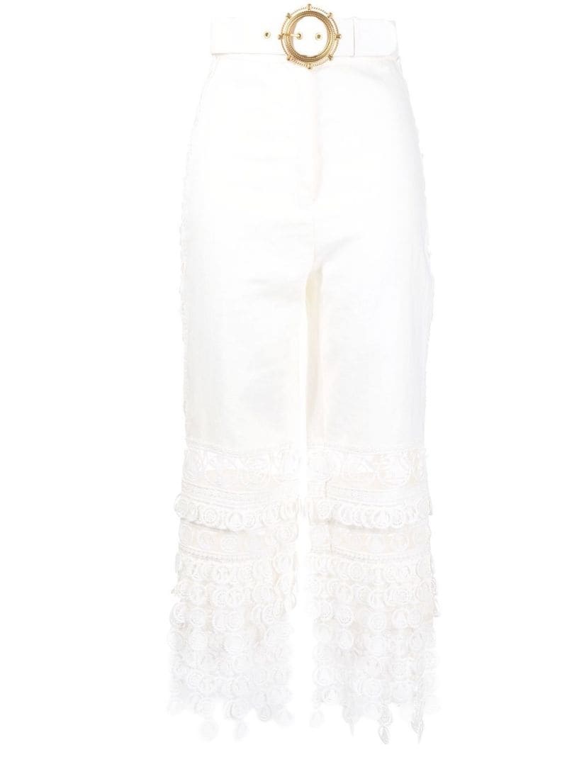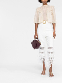high-waisted embroidered-design trousers Zimmermann's elegant design style is showcased in an innovative way on this pair of SS23 collection trousers. Sheer panels and embroidered detailing highlight the nautical inspiration for this garment in an understated way. Imported Composition Outer: Polyester 100%, Linen/Flax 100%, Silk 100% Lining: Cotton 100% SIZE & FIT Model measurements Height 5 ft 11 in(1.8 m) Bust/Chest 31.49 in(80 cm) Hips 35.82 in(91 cm) Waist 24.8 in(63 cm) FittingInformation This piece fits true to size. We recommend you get your regular size Designed to be fitted at the waist and hips, loose over the leg Made with a mid-weight non-stretch fabric Washing instructions Dry Clean Only