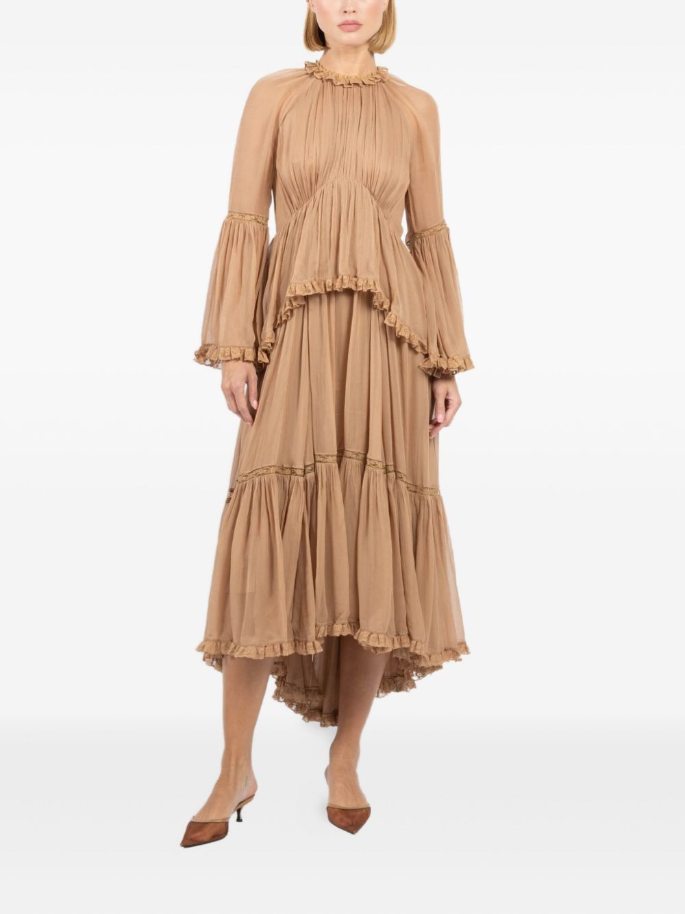 Hypnotic asymmetric-hem midi dress Highlights - Beige - Ruffled trim - Ruffled hem - Bell sleeves - Crew neck - Lace trim - Asymmetrical hem Imported Composition Viscose 100% Washing instructions Read Manufacturer Guidelines
