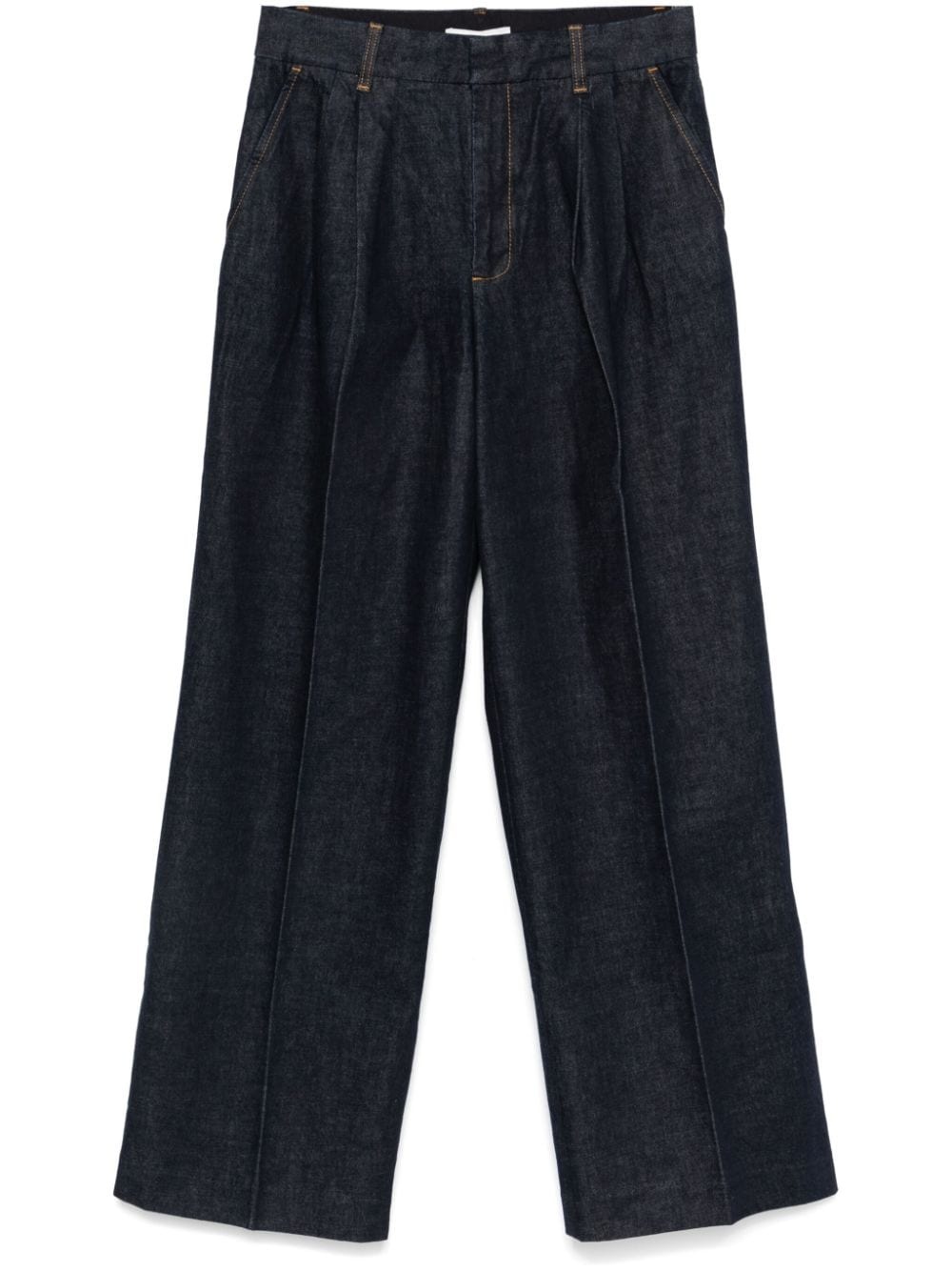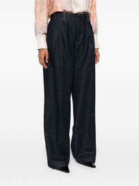 Illustration jeans Highlights - Navy blue - Denim - Concealed front button, hook and zip fastening - Contrast stitching - Belt loops - Two side slash pockets - Front pleat detailing - Logo tag to the back - Two rear welt pockets - Full-length Imported Composition Lining: Polyester 86%, Cotton 14% Outer: Viscose 27% SIZE & FIT Model measurements Height 5 ft 10 in(1.77 m) Bust/Chest 33.07 in(84 cm) Hips 37 in(94 cm) Waist 24.8 in(63 cm) FittingInformation Designed with a wide-leg cut, these trousers allow for a close fit at the waist and offer a loose and roomy fit over the leg Sturdy and hard-wearing, this denim piece offers no stretch