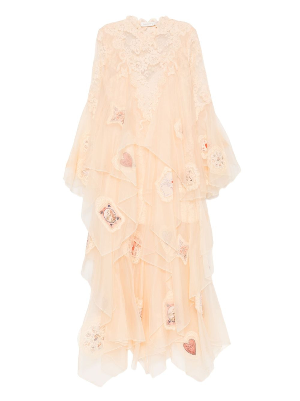 lace ruffled dress Highlights - Beige - Ruffled tiers - Heart embroidered - Asymmetric hem Imported Composition Silk 100% SIZE & FIT Model measurements Height 5 ft 9 in(1.76 m) Bust/Chest 31.88 in(81 cm) Hips 35.43 in(90 cm) Waist 24.8 in(63 cm) Washing instructions Read Manufacturer Guidelines