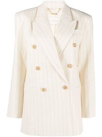 Luminosity pinstriped double-breasted blazer Highlights - Cream white - Wool-cotton blend - Pinstripe pattern - Peak lapels - Double-breasted button fastening - Long sleeves - Buttoned cuffs - Chest welt pocket - Two front jetted pockets - Italian rear vents Imported Composition Outer: Wool 86%, Cotton 14% Lining: Viscose 73%, Silk 27% SIZE & FIT Model measurements Height 5 ft 10 in(1.79 m) Bust/Chest 32.67 in(83 cm) Hips 34.25 in(87 cm) Waist 24.4 in(62 cm) Measurement SLEEVE LENGTH 17.32 in(44 cm) Shoulder Width 18.11 in(46 cm) LENGTH 29.92 in(76 cm) WAIST 40.15 in(102 cm) BUST 40.94 in(104 cm) FittingInformation Designed for a boxy fit, intended for a loose fit throughout The internal shoulder pads offer a structured shape Made from a midweight non-stretch fabric This piece fits true to size – take your usual size