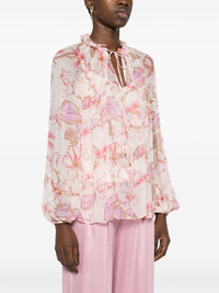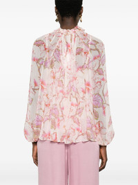 Matchmaker Billow floral-print blouse Romantic blooms and billowing silhouettes are synonymous with ZIMMERMANN, and this Matchmaker Billow blouse is a prime example. It's cut from lightweight chiffon and decorated with hibiscus flowers in pastel pink hues. The long puff sleeves and a tied ruffle neck also contribute to the ethereal appeal. Highlights - Coral pink - Floral print - Blouse: - Crepe texture - Cascading knife pleats - Gathered tie neck - V-neck - Long puff sleeves - Elasticated cuffs - Straight hem - Slip insert: - Satin finish - Adjustable spaghetti straps - V-neck - Slip silhouette - Straight hem Made in United States Composition Outer: Viscose 100% Lining: Recycled Polyester 86%, Spandex/Elastane 14% SIZE & FIT Model measurements Height 5 ft 11 in(1.8 m) Bust/Chest 32.67 in(83 cm) Hips 36.22 in(92 cm) Waist 24.4 in(62 cm) Measurement SLEEVE LENGTH 17.32 in(44 cm) LENGTH 26.77 in(68 cm) WAIST 32.28 in(82 cm) BUST 29.92 in(76 cm) FittingInformation Designed for a relaxed fit, this piece allows for comfort and movement when worn The detachable slip sits just away from the body, offering a close yet comfortable fit Made from a midweight fabric This piece fits true to size – take your usual size Washing instructions Dry Clean Only