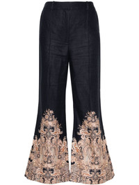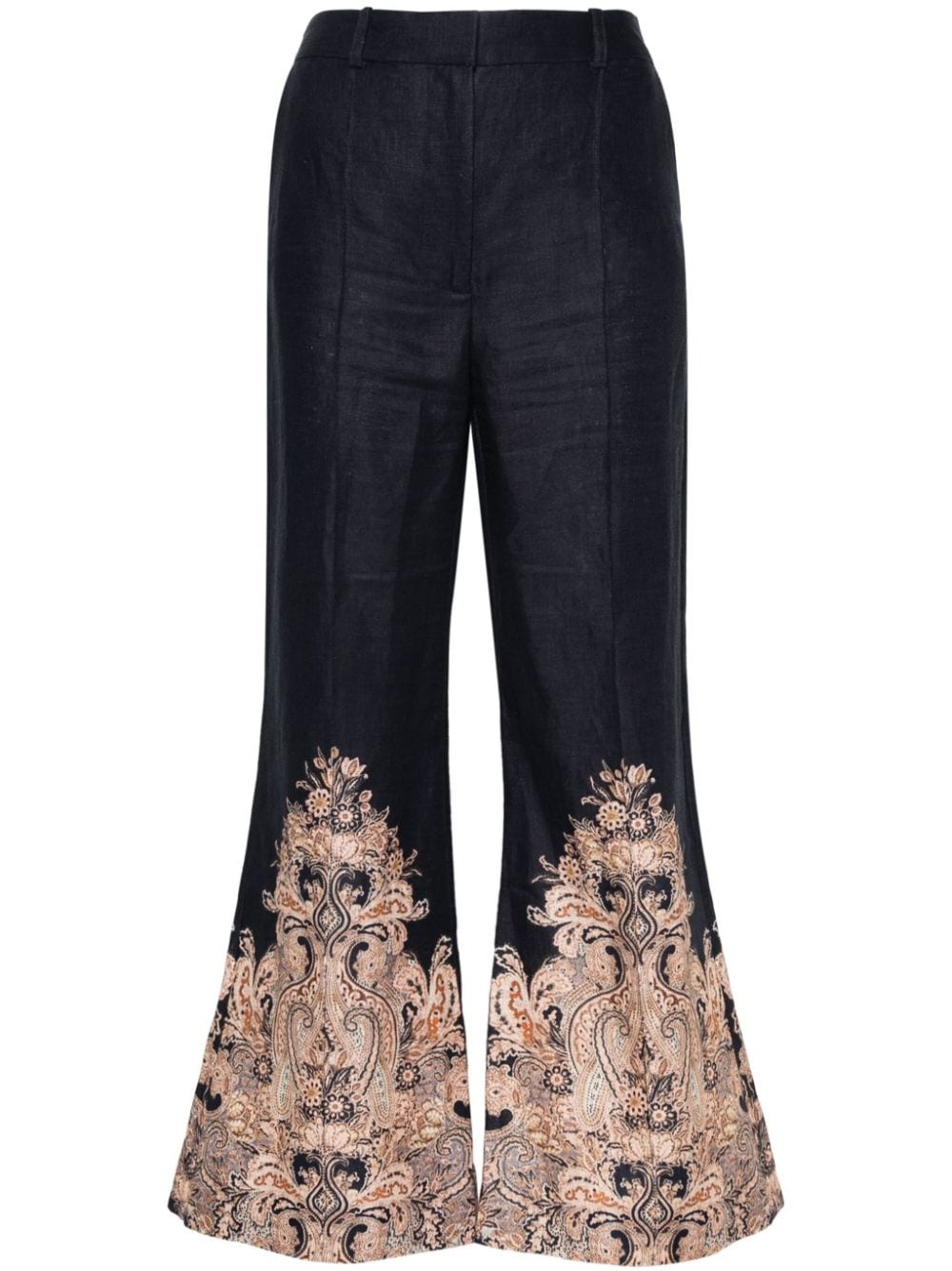 Natura high-waist flared trousers Highlights - Navy blue/powder pink - Linen/flax - Paisley print - High-waisted - Belt loops - Raised seam detail - Two diagonal pockets to the sides - Two rear welt pockets - Flared - Concealed front button, hook and zip fastening Made in United States Composition Lining: Cotton 100% Outer: Linen/Flax 100% SIZE & FIT Model measurements Height 5 ft 9 in(1.75 m) Bust/Chest 34.64 in(88 cm) Hips 36.61 in(93 cm) Waist 26.37 in(67 cm) Measurement FRONT RISE 11.22 in(28.5 cm) HIPS 37.79 in(96 cm) WAIST 29.13 in(74 cm) FittingInformation Designed with a flared hem, these trousers allow for a close fit at the waist with a slim fit over the leg and widening towards the hem Made from a midweight non-stretch fabric This piece fits true to size – take your usual size