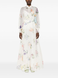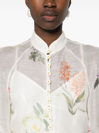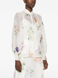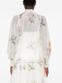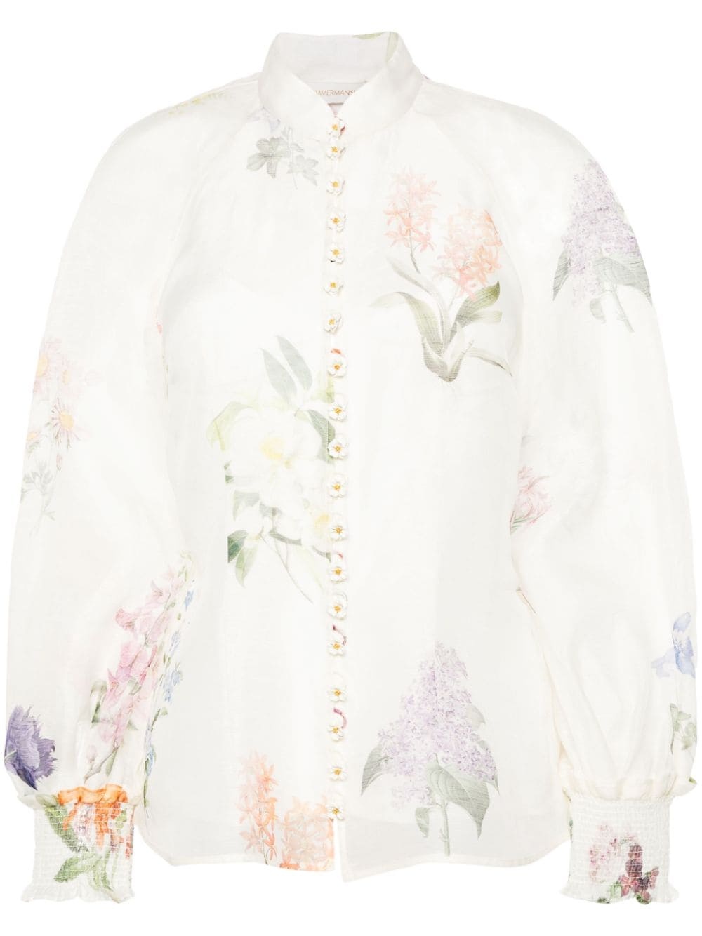Natura sheer blouse This Natura blouse spotlights ZIMMERMANN's romantic aesthetic. It's spun from delicate sheer organza and embellished with the seasonal Botanical print. The puffy sleeves and floral-shaped buttons enhance the piece's charm. Highlights - White/multicolour - Linen-silk blend - Semi-sheer construction - Slub texture - All-over floral print - Rounded collar - Long sleeves - Shirring cuffs - Fitted waistline - Internal logo tag - Internal slip top - Straight hem - Floral buttons - Front button fastening Imported Composition Outer: Linen/Flax 53%, Silk 47% Lining: Recycled Polyester 86%, Elastane 14% SIZE & FIT Model measurements Height 5 ft 11 in(1.8 m) Bust/Chest 32.67 in(83 cm) Hips 36.22 in(92 cm) Waist 24.4 in(62 cm) FittingInformation Designed for a slim fit that sits just away from the body offering a close yet comfortable fit The detachable slip sits just away from the body, offering a close yet comfortable fit Made from a lightweight fabric This piece fits true to size – take your usual size