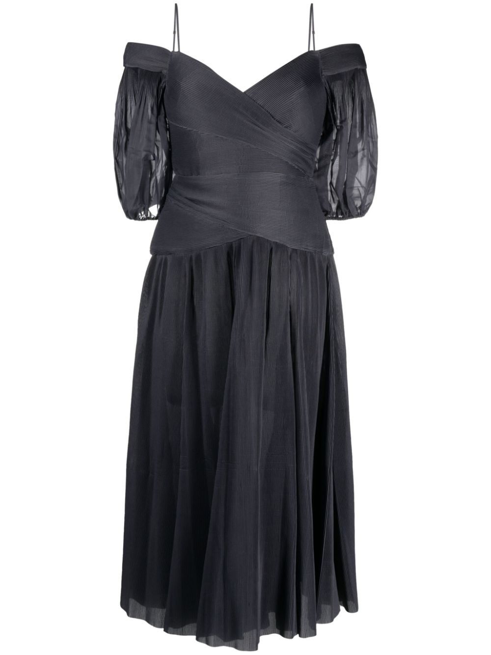 off-shoulder pleated midi dress Exemplifying ZIMMERMANN's penchant for graceful designs, this navy blue evening dress features an off-shoulder silhouette with delicate thin straps. The rear zip fastening ensures a secure fit, while the pleated skirt adds a touch of refined movement to the calf-length piece. Highlights - Navy blue - Cotton - Off-shoulder - Thin straps - Rear zip fastening - Pleated skirt - Calf-length Imported Composition Outer: Polyester 100% Lining: Cotton 100% SIZE & FIT Model measurements Height 5 ft 11 in(1.8 m) Bust/Chest 31.88 in(81 cm) Hips 35.03 in(89 cm) Waist 24.01 in(61 cm) FittingInformation Designed for a close fit at the chest and waist with a loose fit at the hip The adjustable shoulder straps allow for a preferred fit when worn Made from a midweight non-stretch fabric This piece fits true to size – take your usual size Washing instructions Dry Clean Only