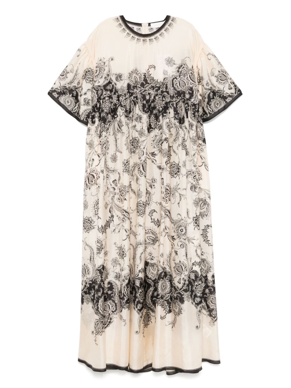 paisley-print maxi dress Highlights - Beige - Black paisley design - Ruffled detailing - Wide short sleeves - Scalloped hemline - Round neckline Imported Composition Silk 100% SIZE & FIT Model measurements Height 5 ft 10 in(1.79 m) Bust/Chest 35.43 in(90 cm) Hips 35.03 in(89 cm) Waist 25.19 in(64 cm) FittingInformation Designed to be unstructured, offering a loose fit throughout Made from a lightweight non-stretch fabric Washing instructions Dry Clean Only