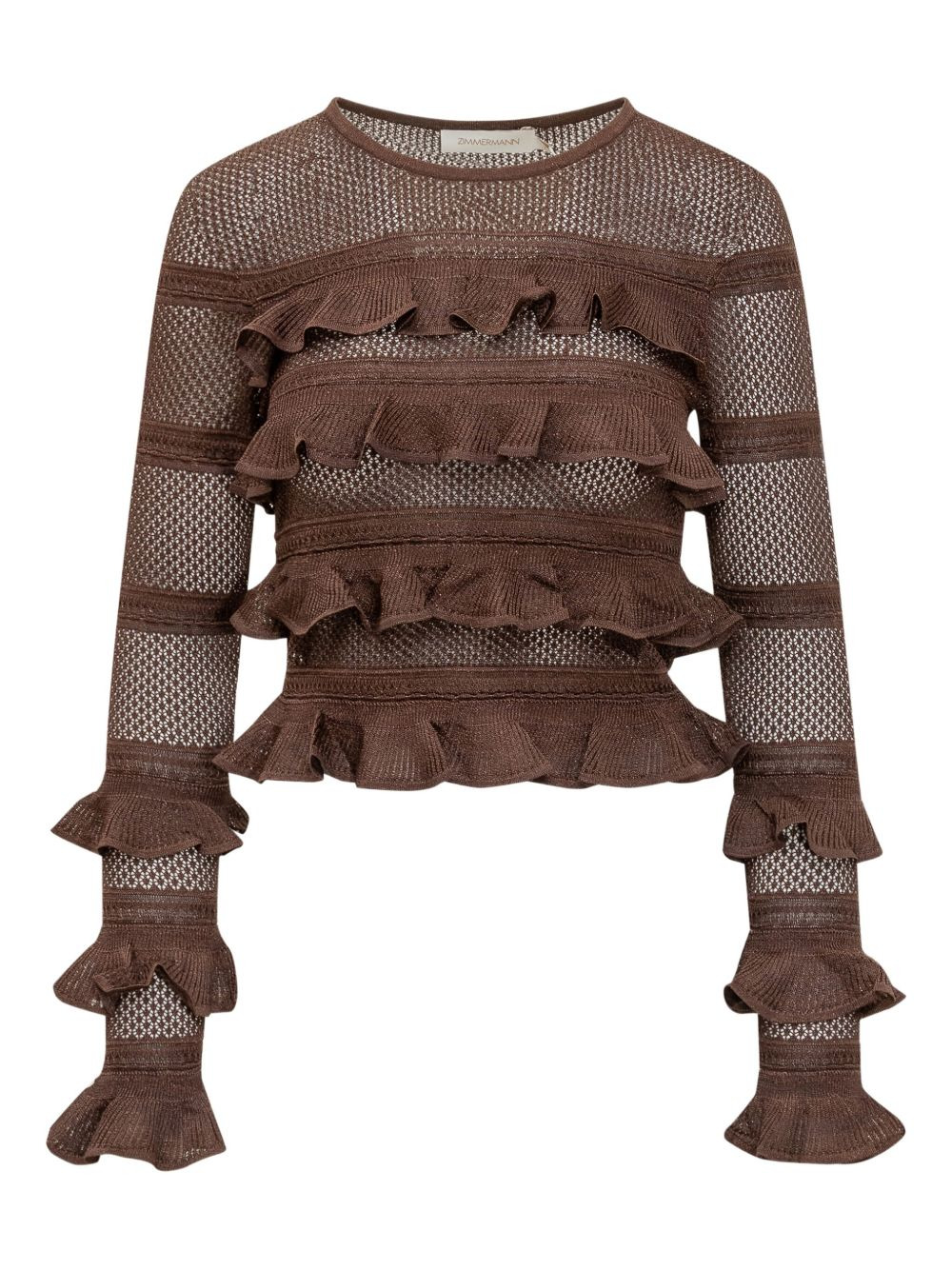 panelled ruffled top Highlights - Brown - Layered ruffles - Long sleeves - Crew neck Imported Composition Viscose 53%, Polyester 34%, Metallic Fibre 13% Washing instructions Read Manufacturer Guidelines
